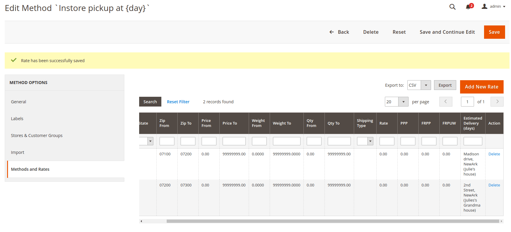 Now go to Methods and Rates and add a rate per each pickup point. In the Rate Configuration window, use the Estimated delivery (days) field to specify a shipping address as below: