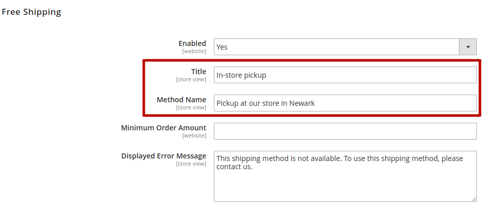 If Julie has a single store, this option is the most suitable one as it requires no extensions. Julie can just rename Magento built-in shipping carriers and methods to emulate the in-store pickup functionality. This is how the settings will look like using Free Shipping: