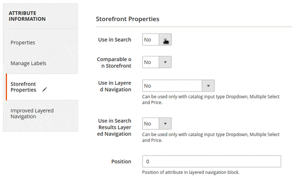 Let’s have a look at the Storefront Properties settings of a particular product attribute.
