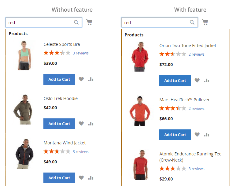 With Advanced Search for Magento 2, it is easy to make the search results more relevant. For instance, the search weight feature allows you to significantly improve the results by color: