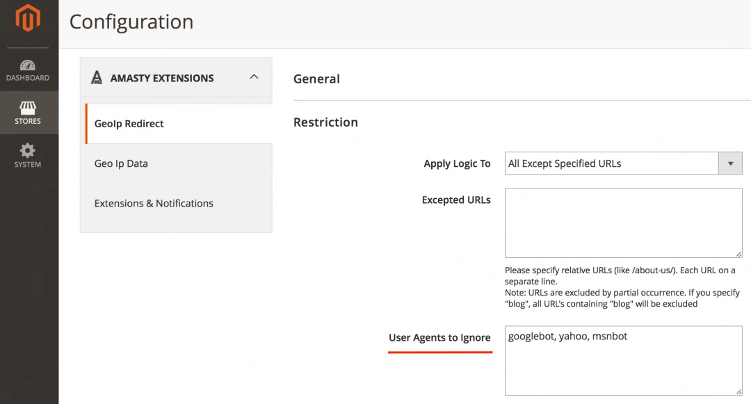 For this, please go to the Magento 2 Admin Panel (if you are not logged in yet) and navigate to Stores -> Configuration -> Amasty Extensions -> GeoIP Redirect. Then in the User Agent to Ignore field, you need to specify user agents that you want to skip. For example, googlebot, msnbot or others and save the changes: