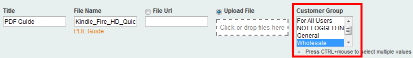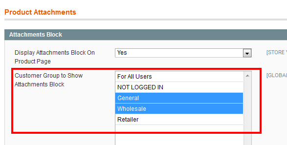 Alternatively, product attachments visibility by customer group can be changed on a product level on the Product Attachments tab: