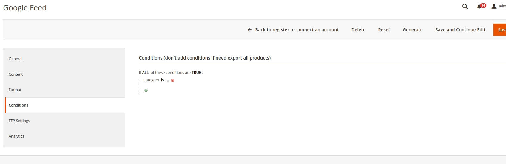 If you want to limit the products that will be pushed into the feed file please use conditions. For example, if your goal is to push the products from a particular category, please select the Category condition from the dropdown and specify the category ID: