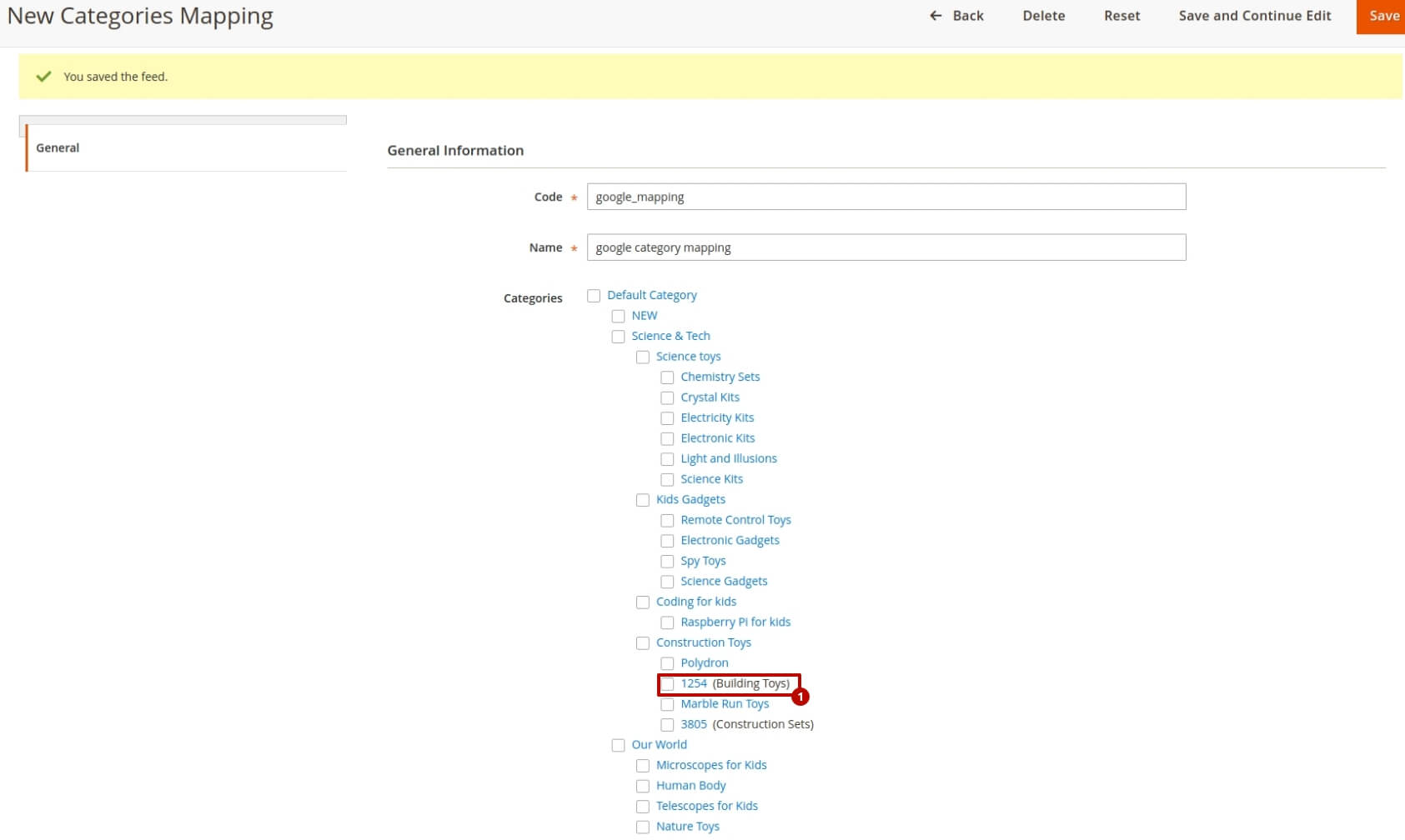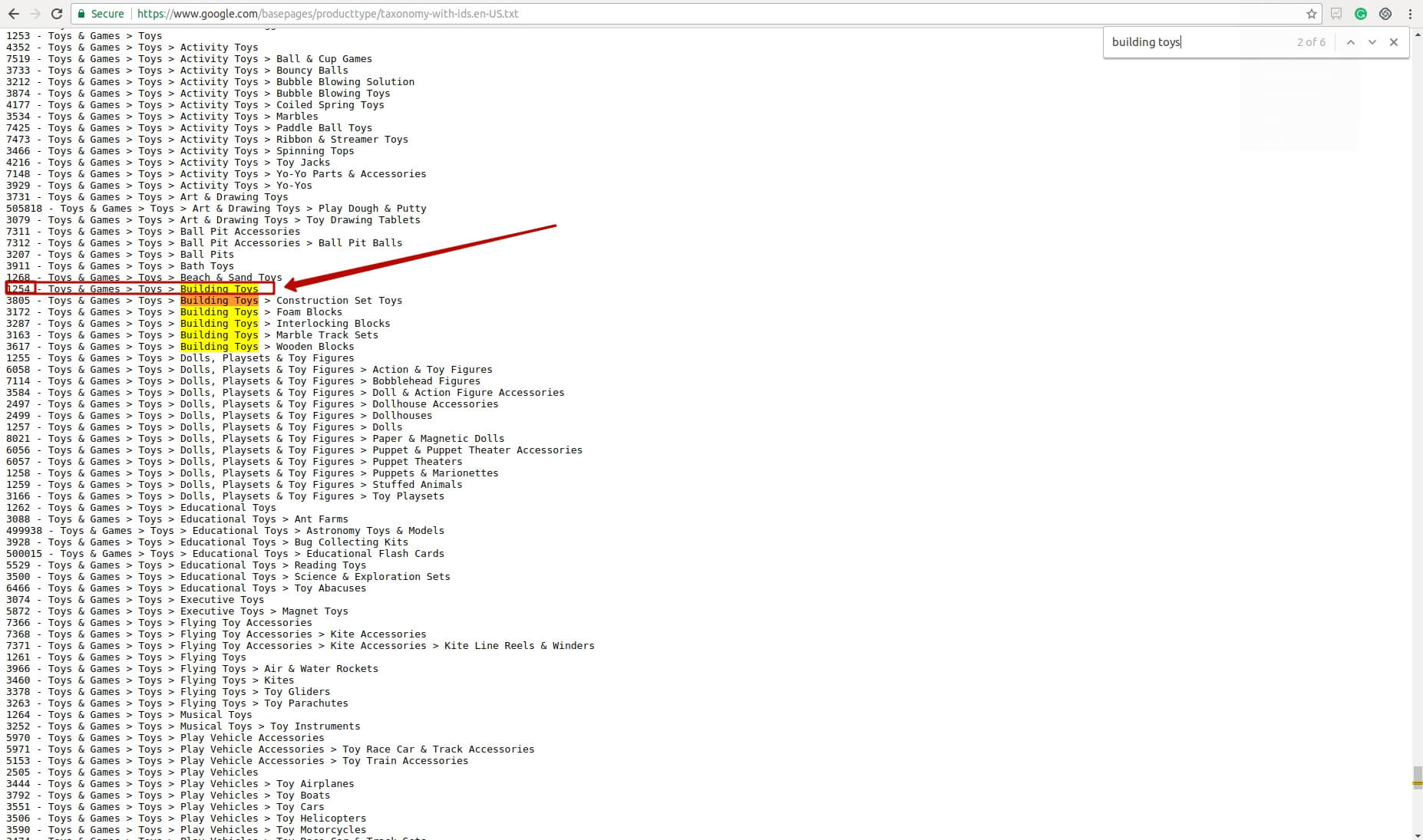 Imagine you have a “Building Toys” category. It needs to be found in the taxonomy first where you'll see a full category path and its ID for it: