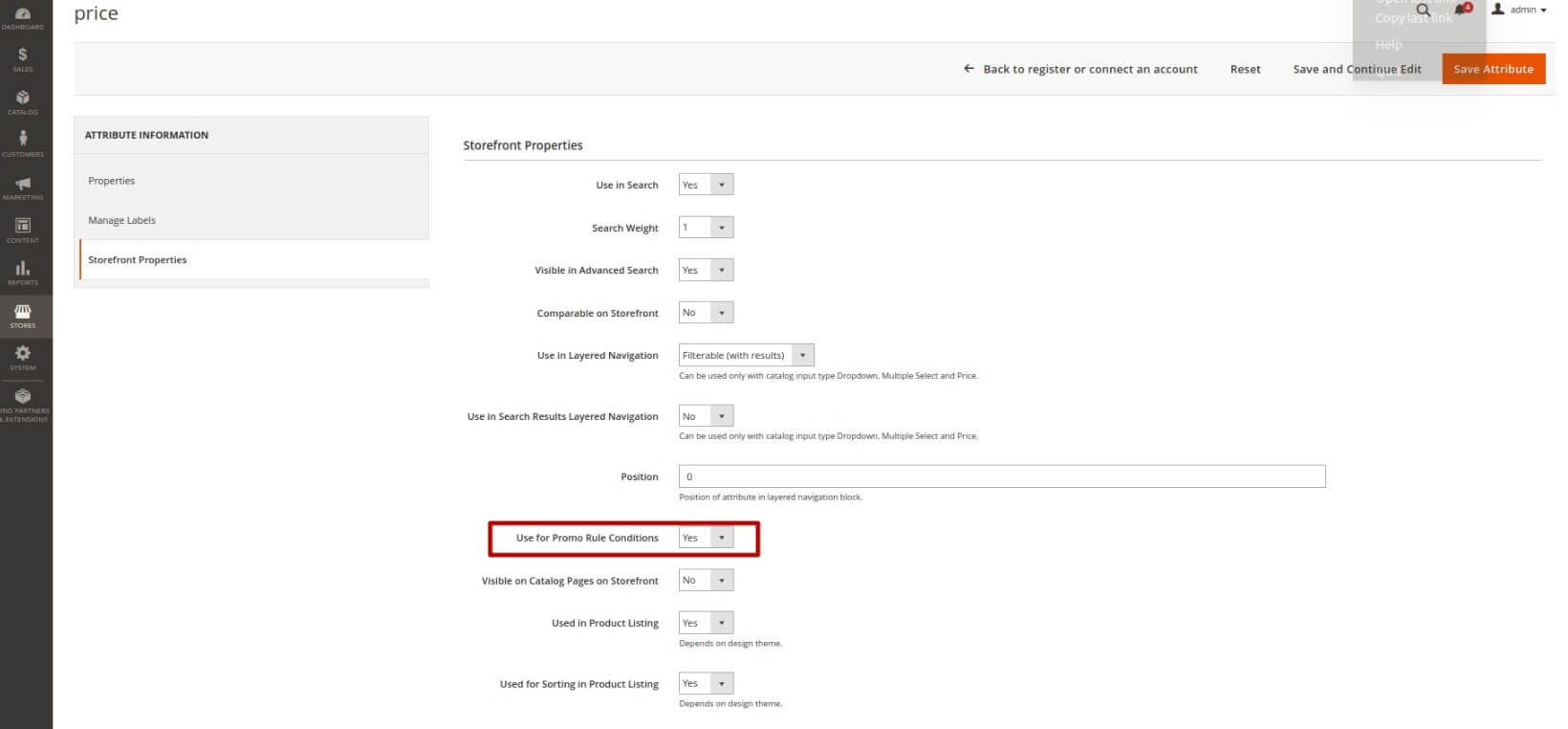 If the desired attribute is not displayed under the condition's list in the feed e.g. price, please, go to Admin>Stores>Attributes>Product>select attribute (price)>Storefront Properties>set “Use for Promo Rule Conditions” to “Yes”: