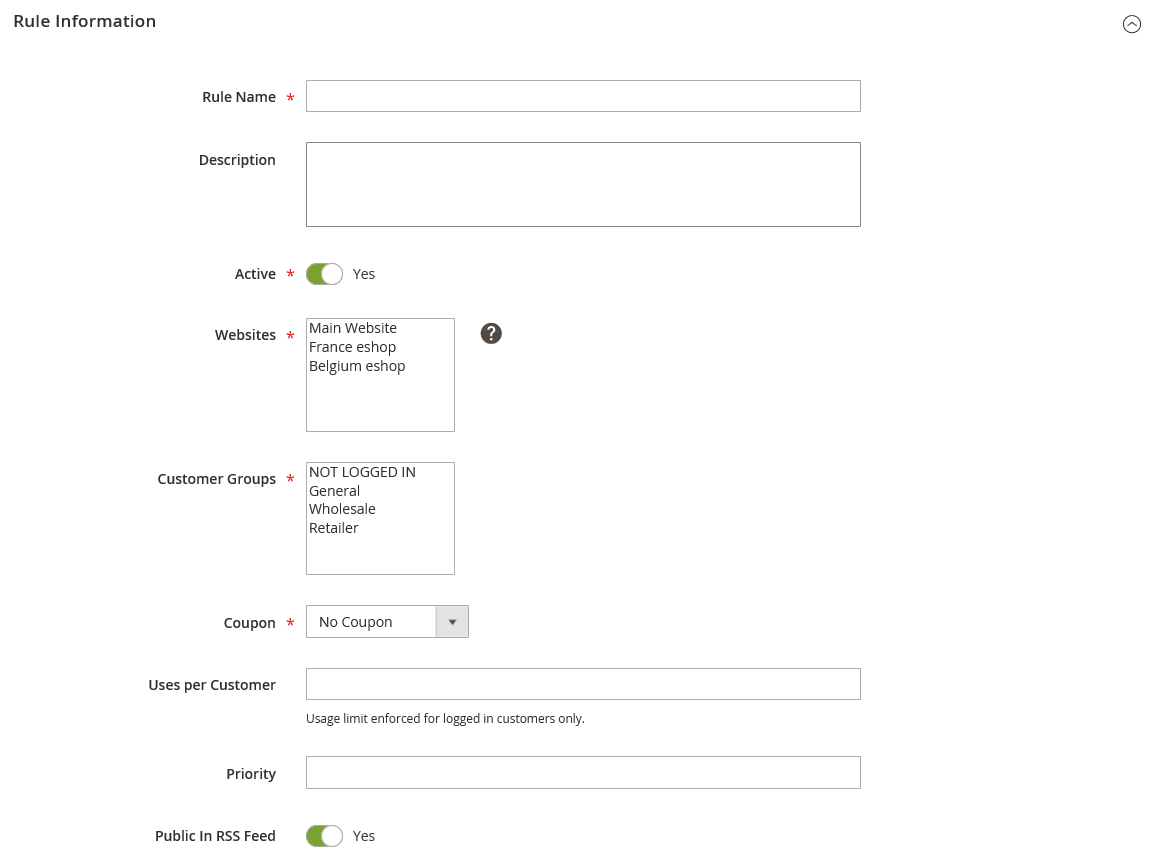 Step 5. Define if you want to use coupons in your rule, set the Priority, and set the Public In RSS Feed field to yes or no.