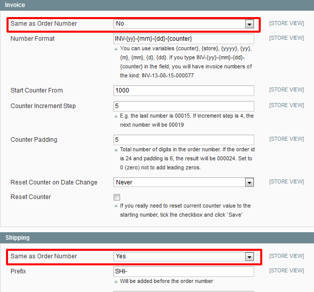 Special Offers Yes, in case if you need to have the shipment number the same as the order number but configure the invoice number independently, you should choose the following settings in System > Configuration > Custom Order Number: