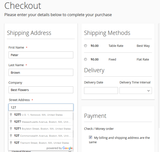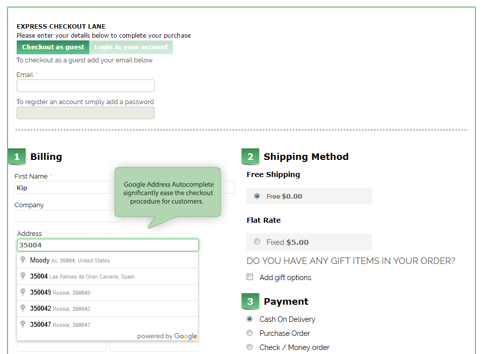 Special Offers Address Auto Suggest (powered by Google Places API) allows to fill in shipping/billing address fields conveniently, using only a part of address as a base.