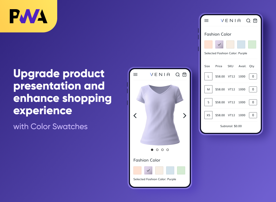 This add-on is a ready-to-use solution for the PWA Studio storefront, supporting features of the original Magento 2 Color Swatches Pro extension. Please keep in mind that for the correct work of the add-on the original extension and a PWA theme must be installed. Learn more in our PWA installation User Guide.
