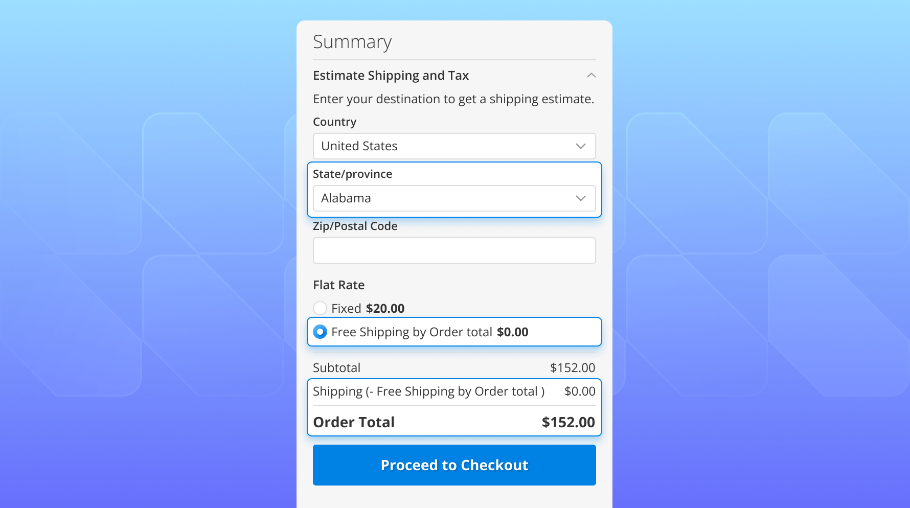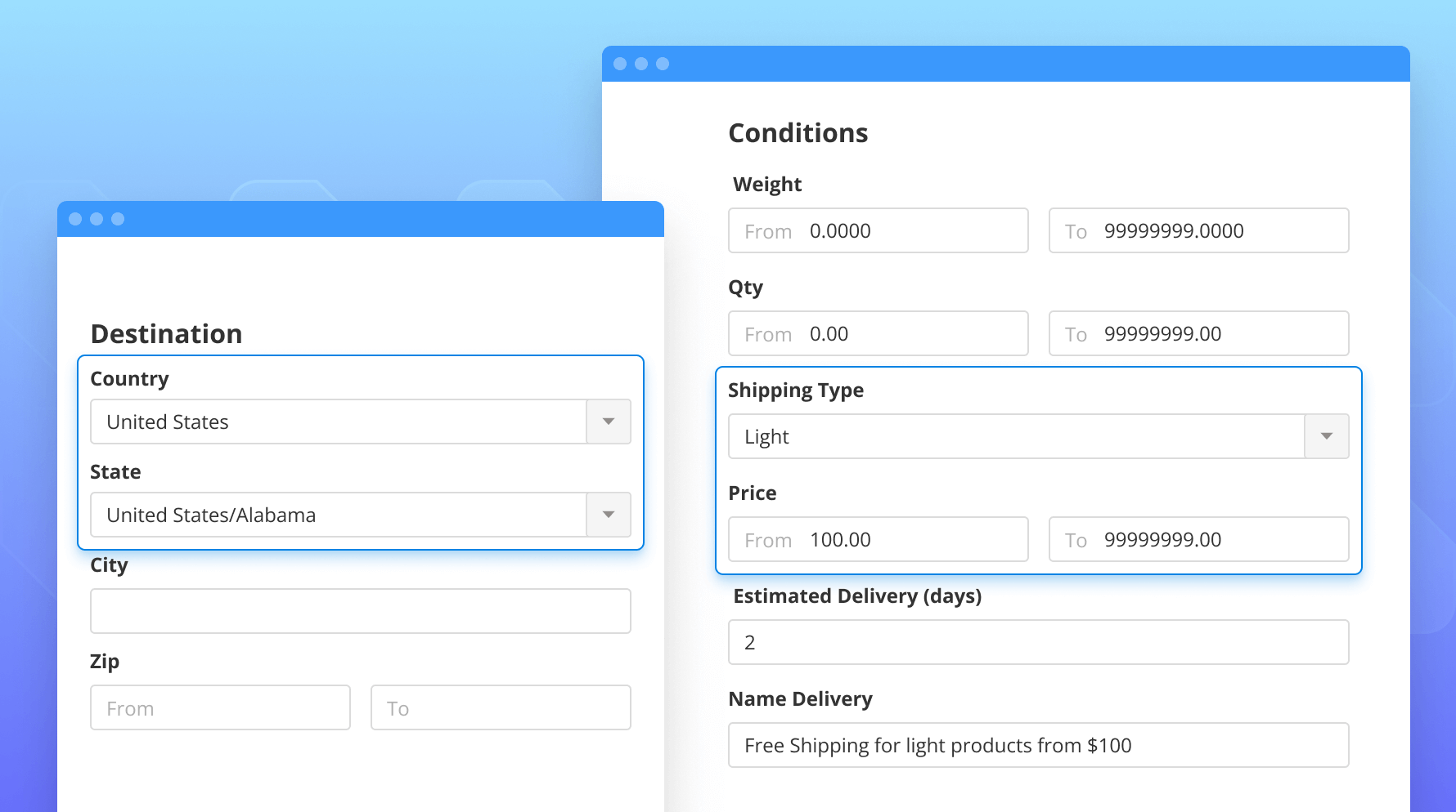 The built-in Magento 2 distance-based shipping calculator tool lets you calculate costs , order subtotal, weight, and price. Therefore, you can combine the necessary parameters to create shipping rates according to your needs. For example, you can set multiple flat rates for Magento 2 shipping, e.g. a $5 cost for orders which weight from 5 to 10 pounds and cost between $15 and $75 when 5 or fewer items are added to cart.